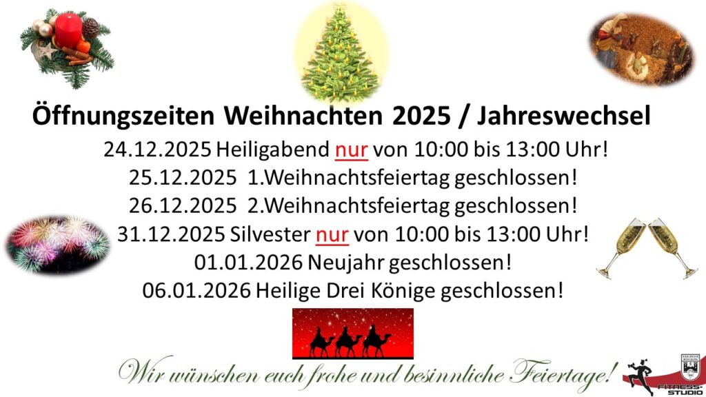 Hier findet Ihr die Öffnungeziten des vereinseigenen Fitness-Studios über Weihnachten und Neujahr