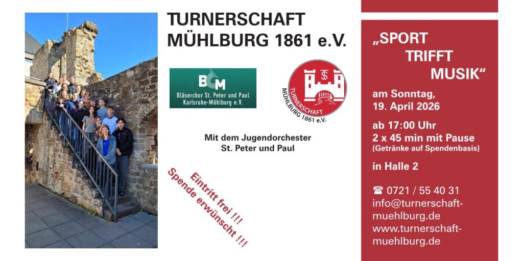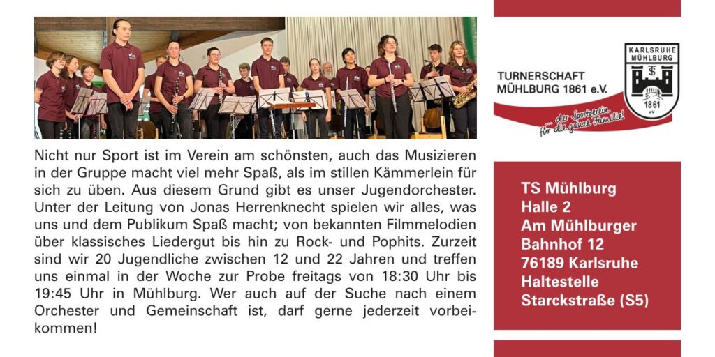 Das Jugendorchester St. Peter und Paul ist am Sonntag, 19. April 2026 ab 17:00 Uhr bei der TS Mühlburg zu Gast. Unter der Leitung von Jonas Herrenknecht spielen das 20-köpfige Jugendorchester von 12 bis 22 Jahren alles, was ihnen und dem Publikum Spaß macht; von bekannten Filmmelodien über klassisches Liedergut bis hin zu Rock- und Pop-Hits.